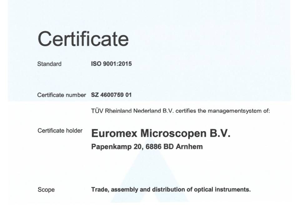 The quality of the equipment and services is high and non-negotiable. The manufacturer (Euromex) is ISO 9001: 2015 certified and all products have CE marking. Axiatech is ISO 9001: 2015 certified for trading and after sales service of scientific equipment. In addition to all the above, we have a team of experienced technicians ready to assist and advise you at any time. Our goal is to create a trusting relationship with each customer individually.