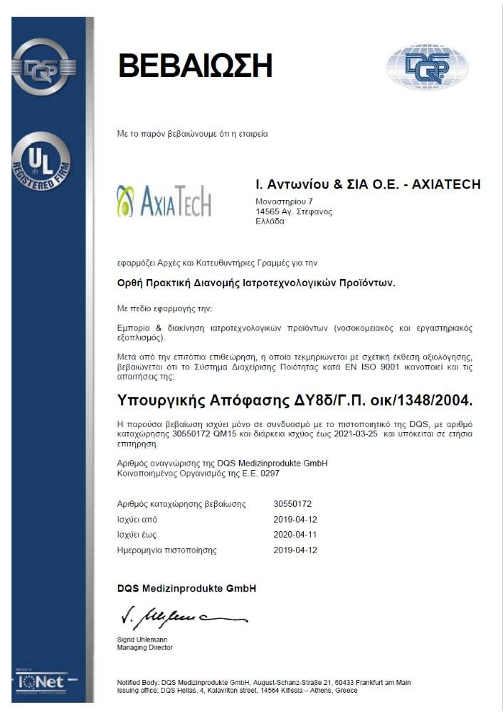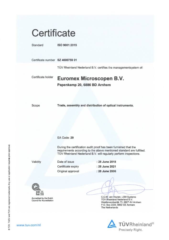 Both the manufacturer and the supplier companies have all the necessary quality certificates. Specifically, the manufacturer company (Euromex) has ISO 9001:2015 and the supplier company ISO 9001:2015 and a certificate of agreement with the Ministerial Decision ΔΥ8δ/Γ.Π. οικ/1348/2004 on the proper practical distribution of medical technology products. Finally, all procucts of microscopy have CE Mark.