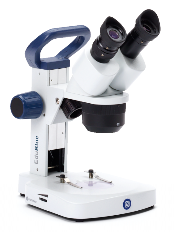 • The rack & pinion and pillar stands of the EduBlue are equipped with ergonomic designed flat bases, complete with 2 object clamps and Ø 60 mm transparent and black/white stage plate
