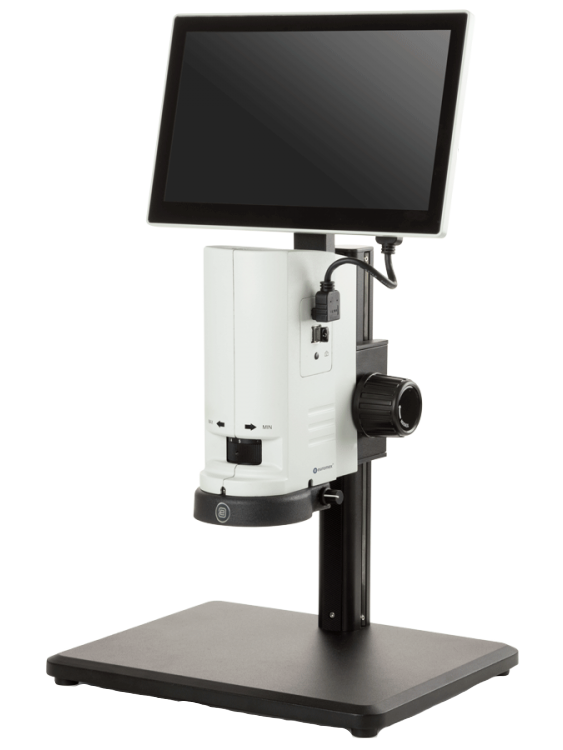 Two other USB ports accept the supplied 32 GB USB memory stick (up to 128 GB) and a supplied wireless mouse that drives the built-in on-screen software. The operator can also take and save images to the SD card by pressing on a capture button at the right side of microscope body