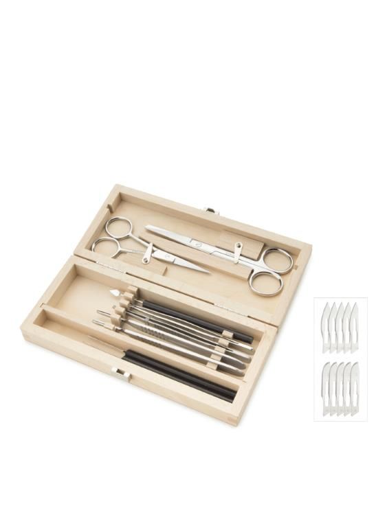 Kit with two dissecting needles straight (PB.5050), dissecting needle lancet-shaped (PB.5054), dressing forceps (PB.5062), dissecting forceps (PB.5067), scissors (PB.5080), dissecting scissors (PB.5084), 2 scalpels (PB.5094), 5 scalpel blades with sharp tip (PB.5095) and 5 blades with blunt tip (PB.5096). All our superior quality instruments are made from stainless steel. Supplied with wooden cabine