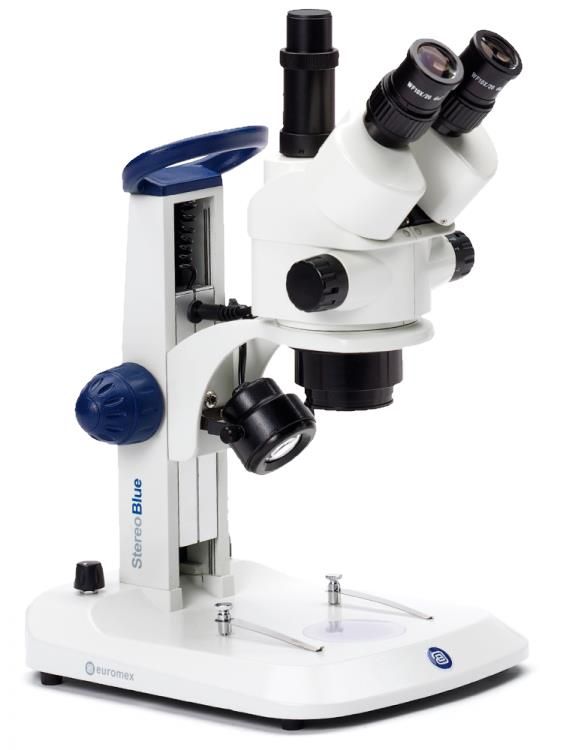 • The rack & pinion and pillar stands of the StereoBlue are equipped with ergonomically designed flat bases, complete with two object clamps and Ø 60 mm transparent and black/white stage plate.